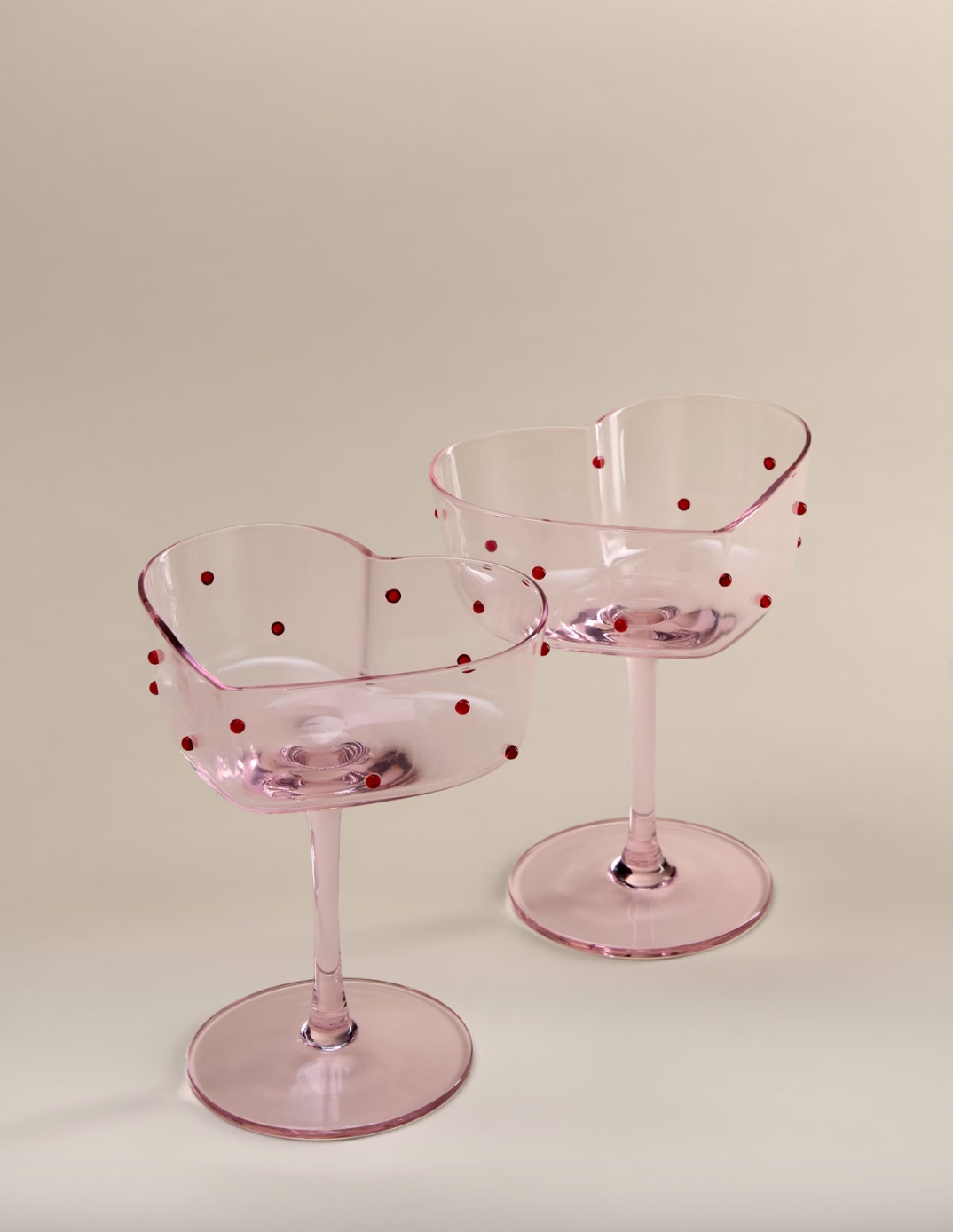 When it comes to bubbles, I really prefer using coupes rather than flutes – they just give a more luxurious feel. These heart-shaped ones are crafted from beautiful pink glass and feature striking red spot details for an extra touch of elegance. I'm completely hooked!