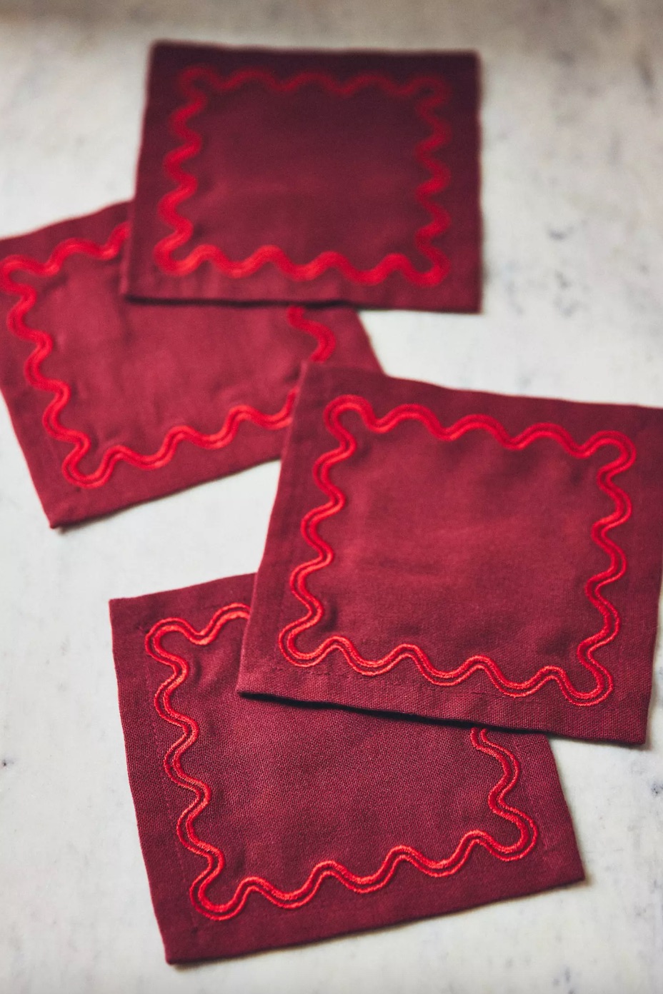 Opting for drinks and snacks instead of a formal dinner? These yarn-dyed cotton cocktail napkins, each featuring a sophisticated scalloped edge, will instantly elevate your evening gathering – while also protecting your surfaces from any water rings.