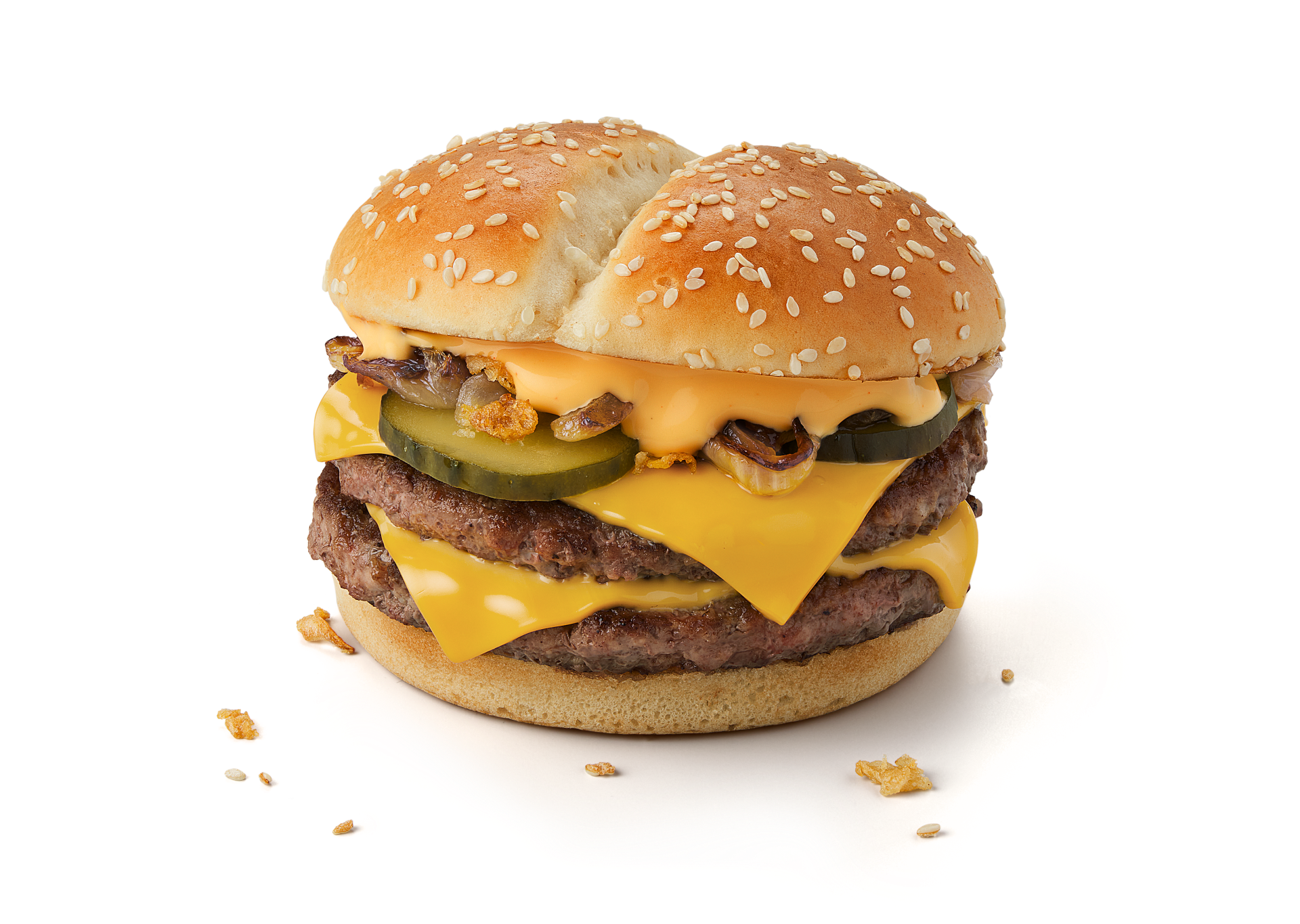 This burger is returning, featuring two beef patties, cheese sauce, cheese slices, grilled and crispy onions, and pickles, all placed in a toasted bun.