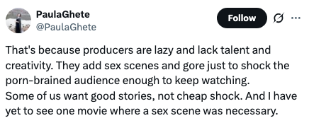 Finally, this person stated, "I understand her perspective, but I don't believe that's the case. They're purists! They don't want explicit content in films because they feel it doesn't contribute to the storyline, which is a remarkably outdated opinion coming from young people."
