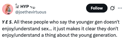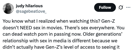 You know what I realized while watching this? Gen-Z doesn't NEED *** in films," another person commented. "There’s *** everywhere. You can easily catch *** in passing these days. The way older generations relate to *** in media is different because we didn't actually have the same level of exposure to it as Gen-Z.