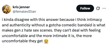 This individual stated, "I somewhat disagree with this response because I believe that intimacy and authenticity without a humorous fix is what causes Gen Z to dislike explicit scenes. They struggle with feeling uncomfortable, and the more intimate it becomes, the more uneasy they get."