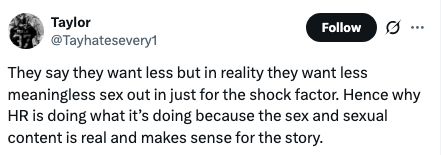 "They claim they desire less, but in truth, they want less pointless content that's included solely for the sake of shock. That's why HR is taking the actions it is, as the content and the dramatic elements are genuine and make sense within the narrative," someone else wrote.